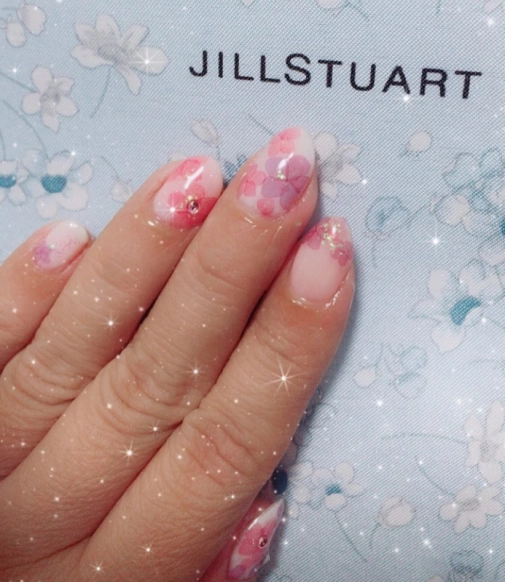 @y__k77さんのネイルは、淡いピンク系のベースに花柄ネイルシールを合わせ、ポイントにストーンもあしらっています。全体にふんわりと優しく上品に仕上がっていますね。ベースや花柄を淡いピンク系でそろえると、春らしい印象の指先になります。