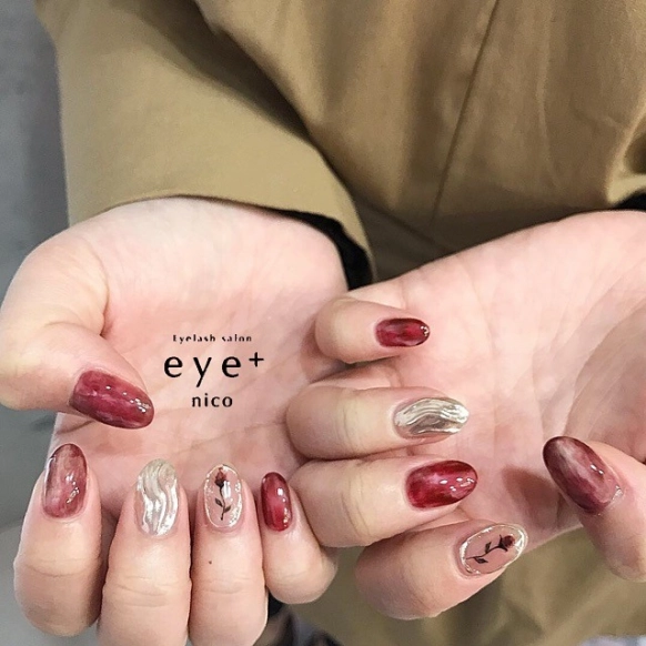囲みネイルにシックな花柄をあしらい、ボルドーカラーやシルバーのミラーネイルと合わせた華やかな花柄ネイルです。ダークな色合いが多くなる冬の季節だからこそ、ボルドーや赤などで指先は明るく華やかにするのがおすすめです。