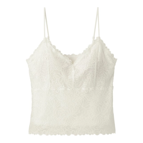 「ブラフィールレーシーキャミソール」1,490円(税抜)は、ゆったりとしたやわらかい生地を使っており、着心地の良さが特徴です。美しいレースがあしらわれたVネックが、デコルテをきれいに見せてくれます。