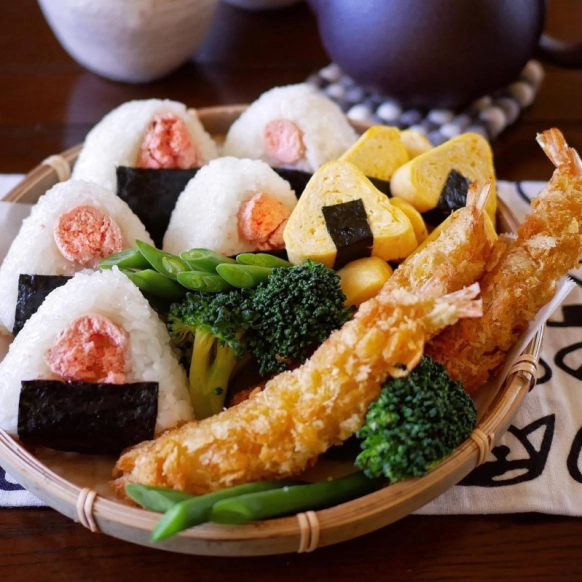 握らないことで一時ブームとなった、おにぎらず。断面から具材の色が見えることで、彩り豊かになるところがメリット。海苔でくるんでいるので、ピクニックシーンでも食べやすいですよ。おにぎらずの例を、ふたつご紹介します。