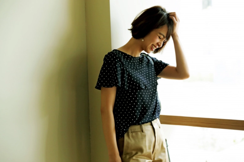 伸縮性に優れているので動きやすいだけでなく、シワになりにくく型崩れもしにくいのが特徴です。生地の表面はハリがあってなめらかなので、上品に見えるのもうれしいポイント。・ドットフリルT×チノパンツでこなれ感を演出☆