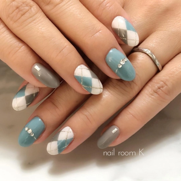 @nail_room_kさんの水色ネイルデザインは、水色×グレー×白の上品なアーガイルネイル。さりげないストーン使いやシルバーのラインが上品さを際立たせてくれますね。シンプルさの中にも華やかさを演出するひと手間が感じられる作品です。ニット系のアートは最後の仕上げをマット仕上げにすると、よりニットらしい質感が出ますよ!また、アーガイルはカラーの組み合わせ次第で春・秋・冬と楽しめるデザインです。