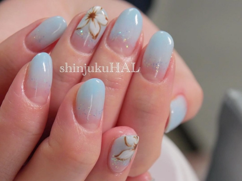 @hal.masamiさんの水色ネイルデザインは、爽やかな色味の水色が印象的。ワンポイントのフラワーが、女性らしさを感じさせてくれます。さりげなく入ったラメの輝きで華やかさをUP♡グラデーションなので、ベタ塗りよりも優しい雰囲気に仕上がりますね。アートが苦手な方は100均などでも豊富にあるネイルシールを使うと手書きのようなネイルデザインが簡単にできますよ。