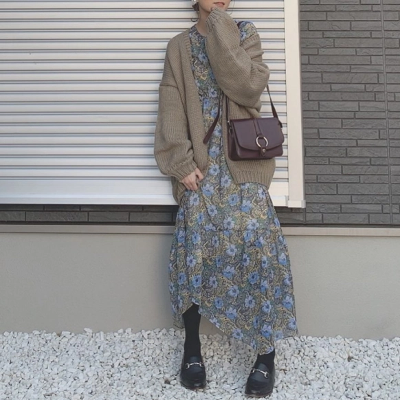 ケーブルニットカーディガンと小花柄ワンピースを合わせていた@yun_wearさん。カーディガンはあえてミニ丈をチョイスして、花柄を目立たせていますね。人気の高まるボリューミーなだぼっとカーデを着こなしたいなら、相性のよい小花柄ワンピと合わせるのがおすすめ。子どもっぽくなりすぎず、おしゃれコーデが完成しそうです。