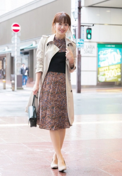 こちらはシフォンのワンピースで軽やかなスタイル。トレンチコート、ワンピース、パンプスは明るいカラーをセレクトして優しいイメージですが、ダークトーンのビスチェとバッグがアクセントになり、甘くなり過ぎないコーデに仕上げています。小ぶりなのに容量の大きいバッグは、きれいめにもカジュアルにも合う万能アイテムですね。