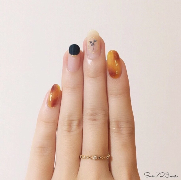 べっ甲フレンチが上品でとても素敵!べっ甲ネイルはパーツを加えたり応用がきくデザインなのでおすすめですよ。マニキュアでべっこうを作るやり方はいろいろありますが、100均アイテムだけで簡単にできる基本的なやり方を紹介します。【用意する物】・クリアイエロー・クリアオレンジ・ブラウン・ベースコート・トップコート【やり方】1.ベースコートを塗ってクリアオレンジを全体に塗る。2.全てのカラーマニキュアの蓋を開けて準備しておく。3.一度塗ったクリアオレンジが乾いたらもう一度クリアオレンジを全体に塗る。4.乾く前にブラウンをポンポンとのせる(適当に置く感じでOK)5.すぐに、置いたブラウンをクリアイエローでぼかしていく。6.好みでシェルや金箔などを埋め込んで立体的に。7.その後、トップコートで仕上げて完成!ぼかすときのコツは、あまり混ぜずに、ブラウンの端の方をトントンとぼかしていくと自然なデザインになりますよ!