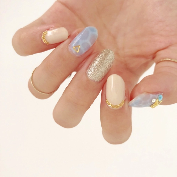 待ちに待ったバケーション休暇には、とびきり浮かれたネイルにチャレンジしてみるのもあり◎@mari___haruさんの水面ネイルとゴールドネイルで仕上げた指は、それだけでも華やかですね。ホワイトをべた塗りした指に、ゴールドチェーンを根元にプラスすれば、さらにテンションアップしたネイルの完成です。ネイルデザインを描くのは難しくても、ゴールドチェーンをプラスするアイデアはマネできそう♡