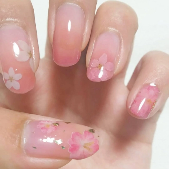 お花見にしていきたいグラデーションネイル。ベースにピンクベージュのグラデーションをして、上から花シールを貼れば完成です。上品な淡い桃色は、大人っぽく仕上がりますね。花シールを端が切れるように貼るのが、おしゃれにするポイントです。