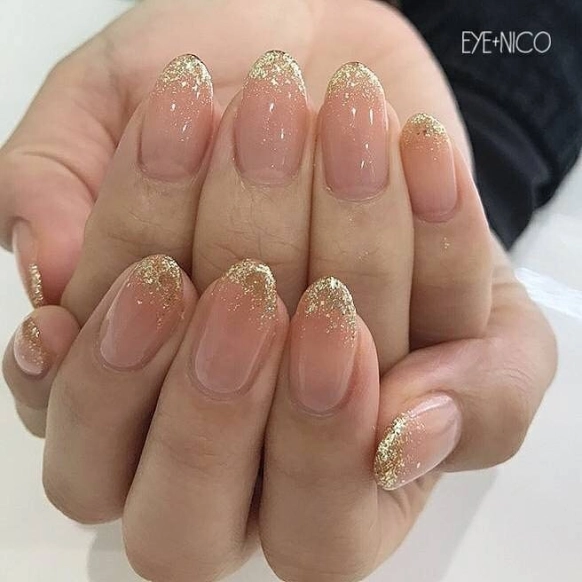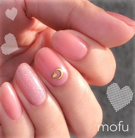 ジューシーなピンクにゴージャスで大人っぽいゴールドのラメをプラスすることで、かわいさの中に、ピリっと光るエレガントさが生まれます。大人っぽいピンクネイルがお好みの方におすすめです。