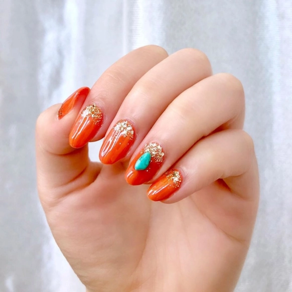 夏は気分もネイルも派手にいきたい!そんな人におすすめなのが、ビビットなオレンジ×キラキラ×ターコイズストーンを使った夏ネイルです。ベースにオレンジを塗って、根本部分にゴールドのラメとホロで輝きをプラス。アクセントにターコイズをのせれば完成です。シンプルな夏コーデにも映える、派手ネイルは元気に夏を過ごせそうですね!