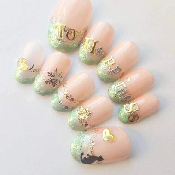 キラキラアイテムを駆使したキュートな文字入りネイル。ハートを見上げる猫のシールがとてもかわいいですね♡パステルカラーのピンクとグリーンの組み合わせが絶妙で、普段用にもお出かけ用にも使いたいデザインです。雪の結晶のネイルシールが秋冬のファッションにもぴったり。