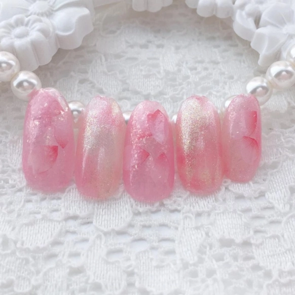 ピンクのラメと桜の花びら風のシールが、舞い散る桜の花びらのようでとても素敵!ずっと眺めていたくなるような素敵なデザインですね。光に照らされるとより美しさを発揮します。お花見シーズンや春のデートにもぴったり!上品なきれいめコーデにもかわいい系コーデにも似合いますよ。