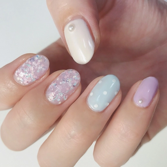 こちらは淡いむらさき色と水色のベースカラー・ラメ・ドットといった、ゆめかわ要素がいっぱい盛り込まれたデザイン♡ふんわりとした優しい色合いなので、たくさんの色やパーツを使っても、それぞれが主張しすぎず、まとまりのある仕上がりに。ラメネイルを全部の爪でなく一部分にだけ塗るのもおしゃれに見せるポイント。春におすすめのふんわりカラーのキラキラネイルです。