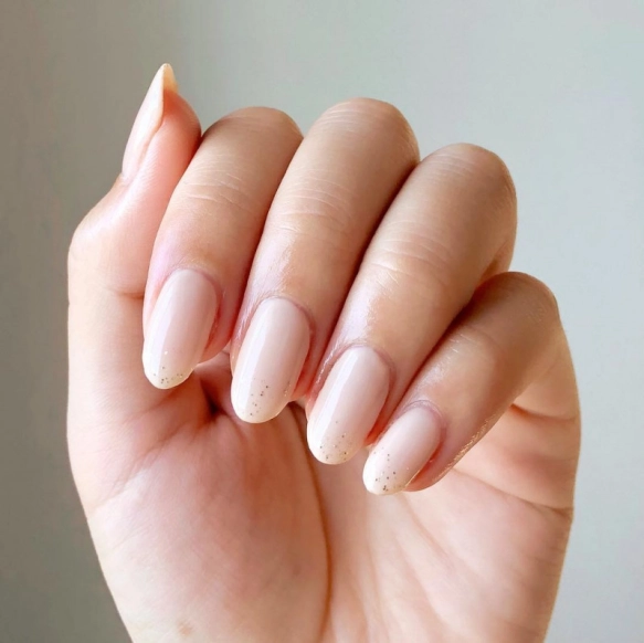 キラキラ好きだけど、学校や職場が厳しいから派手なものはNG…という人は、こんな控えめなキラキラネイルはいかが?ベースはヌーディーなベージュ。ラメ入りネイルをちょんちょんっとツメ先にあしらった上品デザインです。控えめだけど自分だけにはわかるキラキラなので、テンション上げて頑張れそうですね!