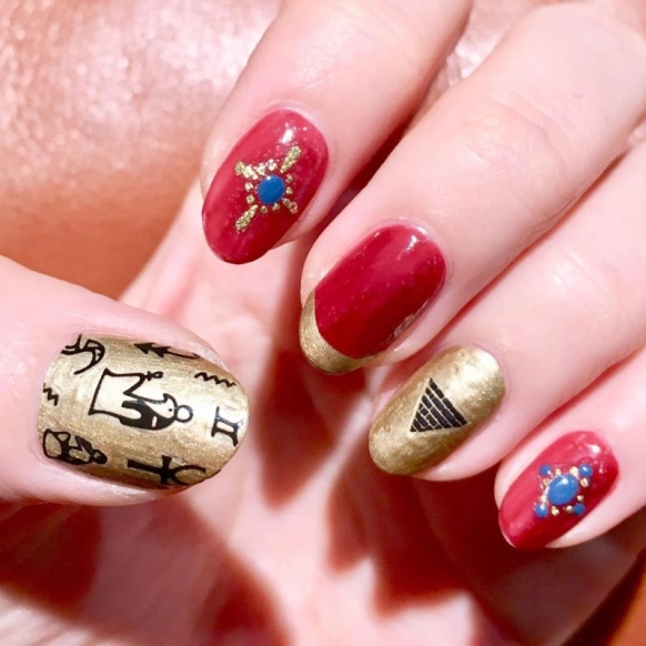 不思議な魅力を放つ、ゴールドと赤を基調とした個性派ネイル。ゴールドベースの部分にはピラミッドやヒエログリフを模したネイルシールを。赤ベースには宝石のようなストーンシールがキラリと光る、古代エジプトを思わせるネイルアート。ターコイズ風ストーンのカラーがアクセントになってとても素敵ですね。
