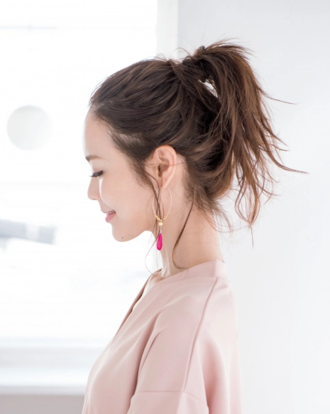 こちらは、ミディアムさんのひっつめハイポニー。オーソドックスなポニーテールなので、鏡なしでも簡単にアレンジできます。トップの位置に作るハイポニーは子どもっぽくなりがちですが、毛先に動きを加えてふわふわにすれば大人かわいく仕上がりますね。耳前と襟足部分に後れ毛を出すことで、ぬけ感とこなれ感がプラスできますよ。