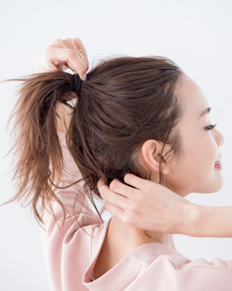 ポニーテールを作るときに髪全体を引っ張ってギュッと結んでしまうと、古いイメージになってしまうのでタブー。ポニーテールを作るときは結んだ後に親指と人差し指の2本を使って、ゴムの周辺をざっくりとほぐしてくださいね。トップは中から引き上げるようにするのが、上手にほぐすコツです。