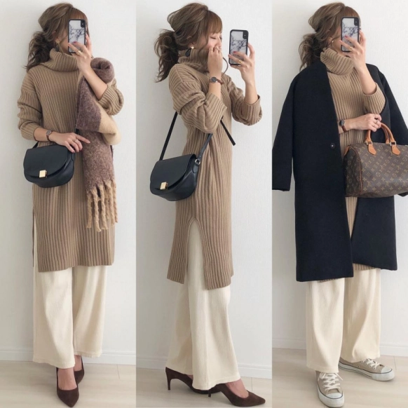 ざっくり感のかわいいロング丈のタートルニットに、きれいめシルエットのワイドパンツを合わせた大人ガーリーコーデです。コートを着ると首周りのふんわりしたタートルネックや、裾広がりのパンツラインが冬にぴったりな、上品なレイヤードスタイルです。