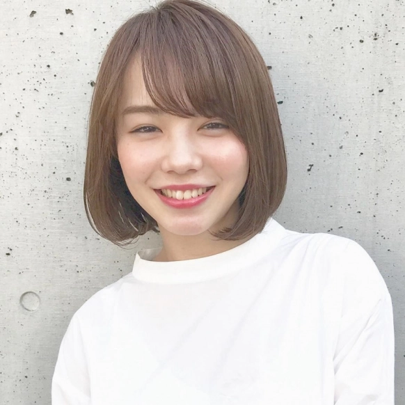 丸顔さんに切りっぱなしボブはベストマッチ!外ハネストレートにすることで、お顔をスッキリと見せることができます。前髪は斜めに流しておでこを少し見せると、お顔の縦のラインをさらに強調できGOOD。浴衣や着物でアレンジがしやすい長さの切りっぱなしボブです。