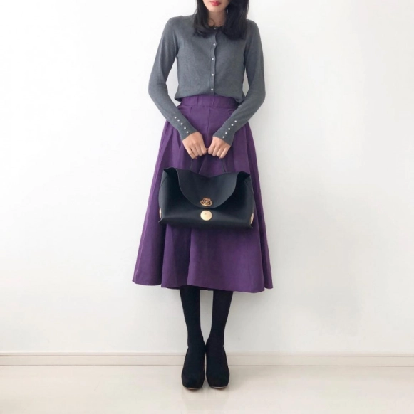 色使いがとてもおしゃれな@toooooko_99さん。パープルのスカートにグレーのカーディガンを合わせてトーンダウン。シンプルなカーディガンですが、先にもご紹介したようにパールボタンがとてもよいアクセントになっています。パールボタンはオフィスコーデにもデートコーデにも最適ですね♡