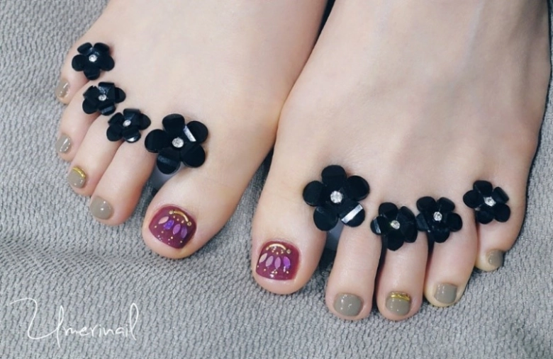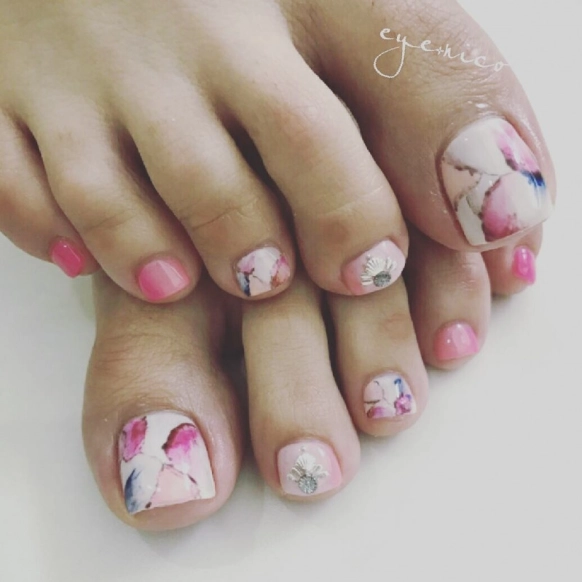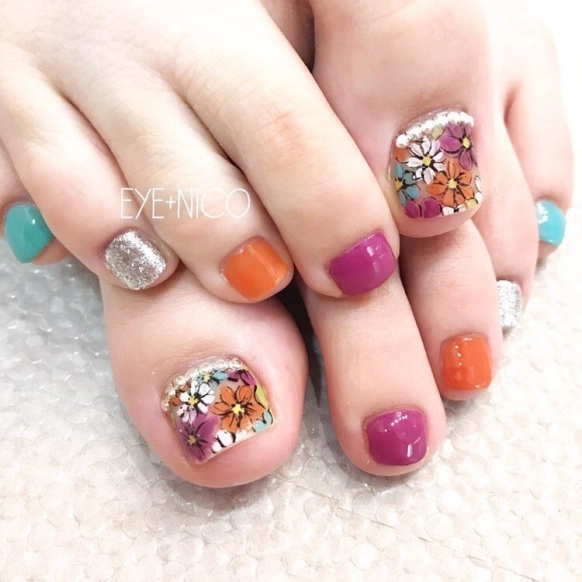 紫、オレンジ、シルバー、ターコイズを使ってカラフルなフットネイルに。親指の爪にあしらったお花のアートネイルには、他の爪に使ったカラーを使うことで、カラフルな中にも統一感が生まれています。