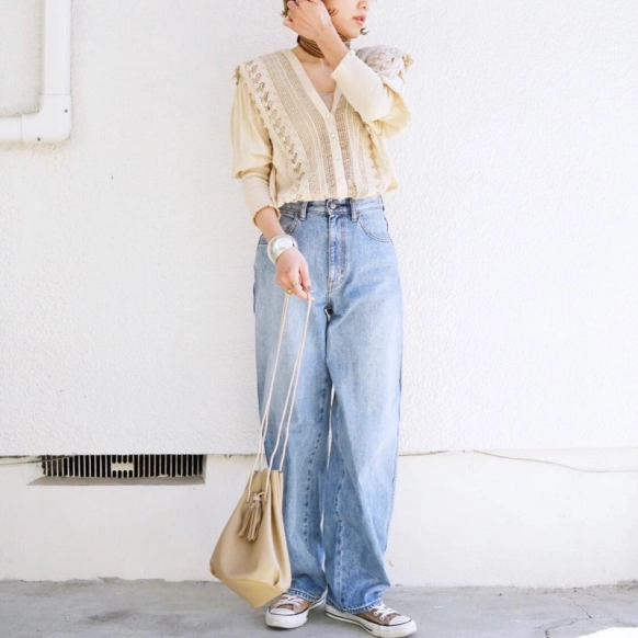 ・ベージュブラウスをワイドデニム×スニーカーでトレンドコーデに♡