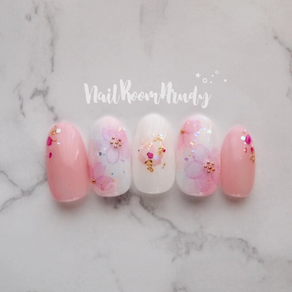 まずは春にぴったりの華やかさくらネイルです。