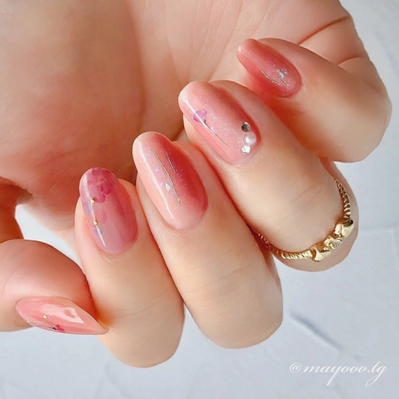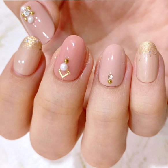 『TMネイルポリッシュ』(ピンクベージュ)・『Gene TOKYO』(パールサンド・ゴールドカラー)・『Ducato(デュカート)』(ストロベリームース)などのナチュラルカラーにパールやストーンを施した大人の雰囲気でとても上品なネイルデザイン。