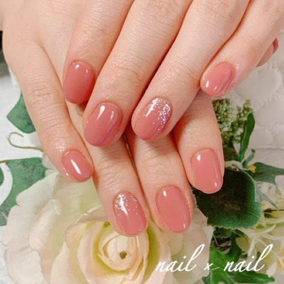 ワンカラーで塗られたナチュラルネイルは、一色だけでも女性らしい印象になりますが、薬指の根元に少しだけ塗られたラメによって、より手先の美しさがアップされます。