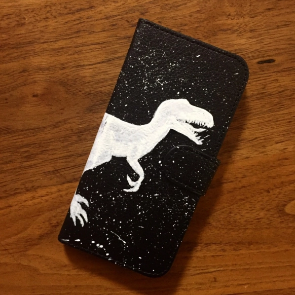 恐竜好きにはたまらないラプトルが描かれたスマホケース。肉食恐竜ならではの迫力と小型肉食恐竜ならではの愛らしさが感じられます。恐竜といえばアースカラーのイメージですが、モノトーンで表現されているので恐竜の存在感がグッと引き出される作品です。