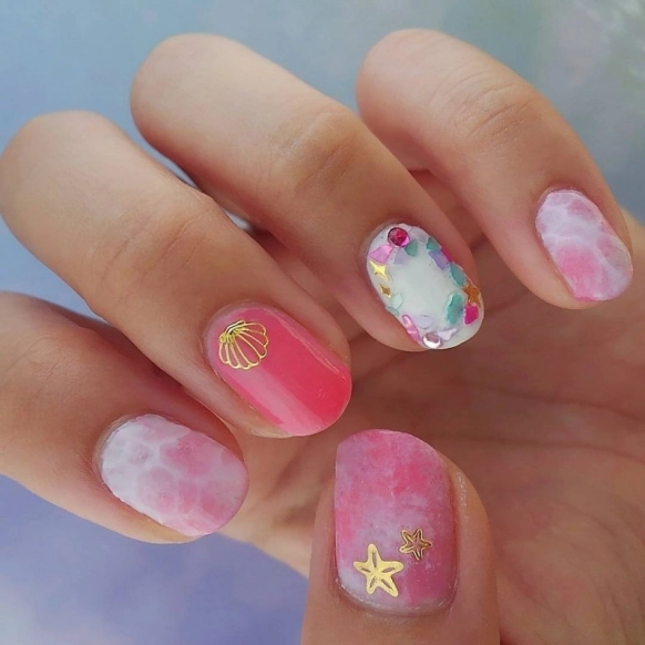 【海にピッタリ!カラフルシェルとペールトーンで涼し気夏ネイル】