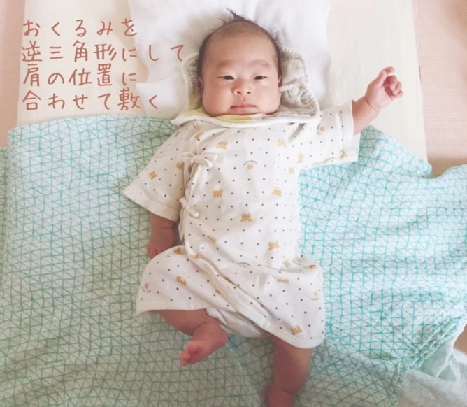 (2)頭だけ出るようにして、赤ちゃんをおくるみの上に置く