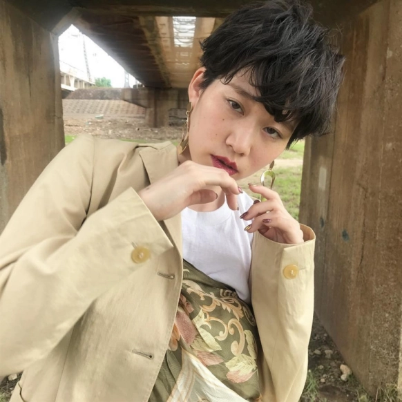 襟足部分はすっきりとさせ、全体的にパーマをかけて動きをつけた黒髪ショートです。ストレートだと重たい印象になりがちですが、パーマのフワフワとしたエアリー感がやさしげな印象に。今季はサイドを短くして耳をすっきりと見せるスタイルが、ショートのトレンドです。