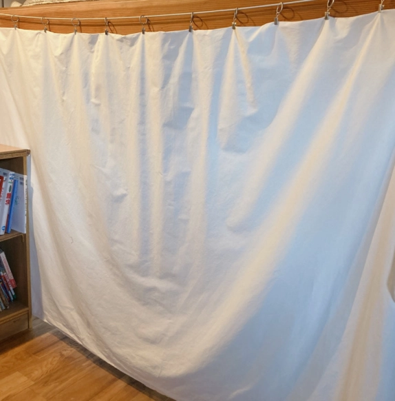 こちらはさきほど紹介したカーテンワイヤーを使った実例。子ども部屋のロフト下にカーテンワイヤーを取りつけ、手持ちの布をプラスすれば、適度に空間を仕切れるカーテンに変身!布を留めたカーテンクリップもダイソーのものなのだとか!