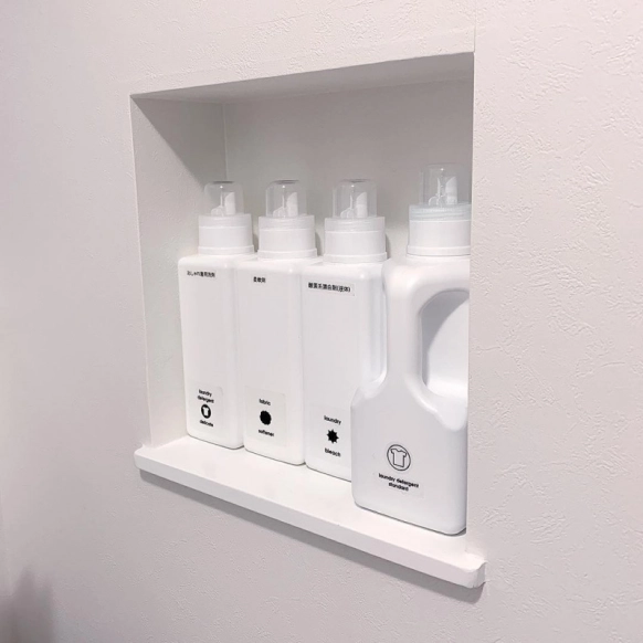 洗濯用の洗剤も生活感が出やすいアイテムですよね。「洗剤詰め替えボトル」は、大きさによって値段も変わってきます。写真の小さい方の600mlは100円、大きい方の1Lは200円。使っている洗剤の容量に合ったシンプルな容器が100均にはそろっていますよ。