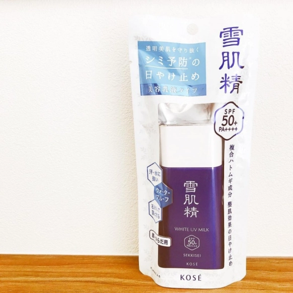 33年も愛されているブランド、『雪肌精(せっきせい)』。“白い肌より雪の肌”とキャッチフレーズにあるように、美白を意識した化粧品ブランドです。雪肌精シリーズにラインナップしている「ホワイトUVミルク」3,000円(税抜)は、さらさらとしたテクスチャーで塗りむらになりにくい乳液タイプ。ハトムギ成分が配合されていて、敏感な肌が荒れるのを防ぎます。日焼けによるシミとソバカスも予防!ウォータープルーフなのに普段通りの洗顔料とボディソープでオフできるのも魅力です。