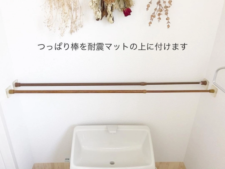 正しい取りつけ方をしていても、落ちてしまう可能性がなくなったわけではありません。そこで耐震マットを利用して落ちにくくする方法もあります。耐震マットを壁と突っ張り棒の間に挟むことで、耐震マットの摩擦力により、100均の突っ張り棒でも落ちにくくなります。@sayaka_j89さんはトイレの突っ張り棒に使用されていますが、家中の突っ張り棒に利用できるアイデアですね。耐震マットは100均でも購入でき、切って使うことも可能ですよ。クローゼットの中で突っ張り棒を使うときにも実践したいアイデアです!