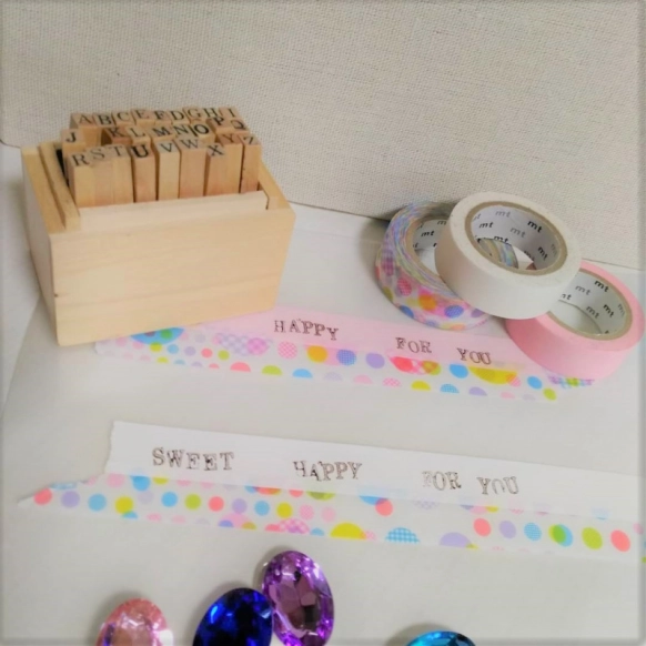 まずは好きなテープとスタンプを用意しましょう。市販のスタンプからお気に入りのものを使うこともできますし、オリジナルの消しゴムはんこやステンシルでオリジナリティを高めてもいいですね。