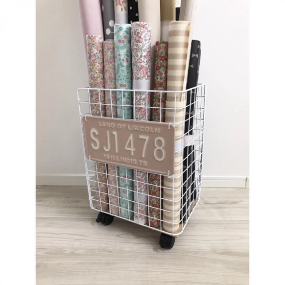 @hiroko_handmadeさんは、ワイヤーラティスとキャスター結束バンドとパンチングボードを組み合わせて、収納スタンドを完成させていました。布が取り出しやすく、可動式なので手軽に扱えそうですよね。ラティスはそのままだとちょっとさみしい印象になるので、写真のようなナンバープレートやお気に入りのデコレーションアイテムをつけて、おしゃれにカスタマイズしてみてくださいね。