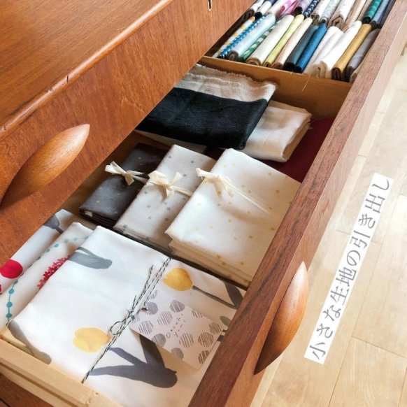@sakuramade_1212さんのポストには、お気に入りの布を引き出しにしまっている様子が。こちらは小さめの生地を収納しているのだそう。まるでお店のディスプレイのようにキレイに収納されている点にセンスを感じます…!引き出し奥の方には、小さくたたんで立てて収納している布たちが。引き出し収納をするときには、立てて並べて収納力をアップしてみるとよさそうですね。