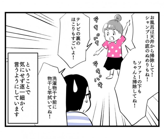 料理は得意なのですが、掃除に関してはいろいろと詰めが甘い旦那。目が悪いので、そもそもあまりゴミをとらえられていないというのもあるのですが…。とは言え、掃除機をかけても棚の上の埃はそのままだったり、お風呂は浴槽しか洗っていなかったりと、掃除の仕方があまりわかっていないところもあるのです。しかし、家事を担当してくれているだけでありがたい旦那に、この上細かいダメ出しまでするのは…と思い、最初は黙っていました。自分が気になるところがあるのなら、自分で掃除してしまおう、そう思っていたのです。が!ふと、これから一生こうして掃除のやり直しをしていくのか…?と考えたときに、気が遠くなってしまい、逐一旦那に言うようにしました。悪いかな…と思って言わなかったのですが、これが案外言って良かったという結果をもたらしました。旦那曰く、言ってもらわないとわからない、ということだそうです。自分では普通に掃除ができているという感覚だというのです。しかし、具体的にどこをどう掃除したら良いのかわからないため、逐一言ってくれた方がわかりやすいとのこと。今では、「お風呂掃除するとき、床もこのブラシで磨いておいてね」、「廊下のこの辺にいつも埃が溜まったままだから気にしてみてね」等、わかって欲しいところは、細かく言うようにしました。息子が生まれてからは、自然と掃除をする機会が増え、夫婦で協力しながら家事や育児をしております。ときには話し合うことも大切だと感じる毎日です。