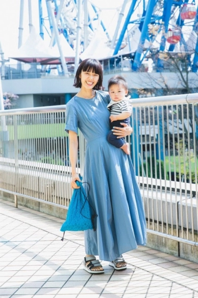 「妊娠中着られなかったお気に入りのワンピースが、産後に着られるようになってうれしいです。シンプルなワンピには、ポイントになるDR.MARTENSのサンダルを合わせて。息子のボーダートップスもブルーで、爽やかなマリンスタイルを意識しました。」