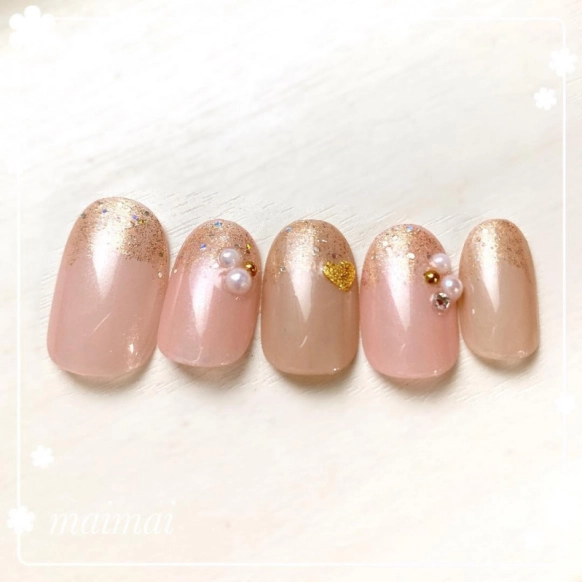 ベースにほんのり輝くパールカラーを使用し、ゴールドラメの入ったネイルを爪の先にのせてた@selfnail.maimaiさんの上品なネイルデザインです。合わせたパールパーツも上品さを増してくれています。フォーマルな日にも使えそうなデザインですね。