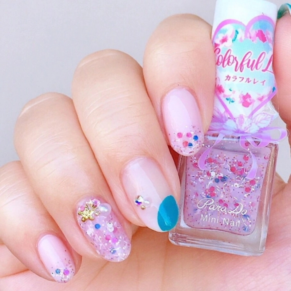 人気のコンビニコスメ『ParaDo(パラドゥ)ミニネイル』の「カラフルレイ」を使った@mayooo.tgさんのネイルデザインです。カラフルなホロがたっぷりのった楽しくてかわいらしい夏ネイルですね。ホロに合わせたブルーのネイルポリッシュも効果的です。
