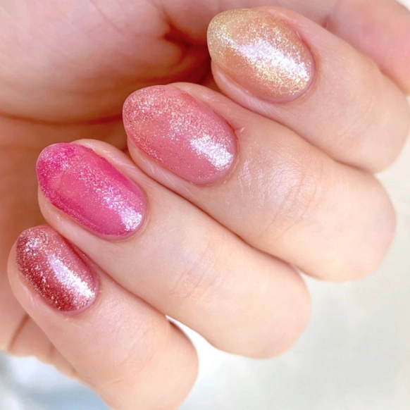 @selfnail.maimaiさんのネイルデザインは、ベースとなるネイルカラーとグリッターネイルのカラーの違いで作るラメグラデーションです。ラメ入りのネイルを2色使って順にベースカラーに重ねることで、美しいグラデーションを作っています。