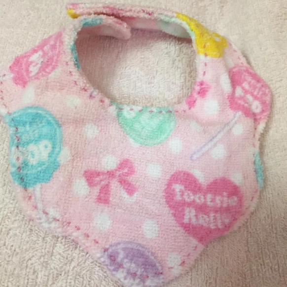 こちらはパステルカラーのバスタオルをベースにリメイクされたベビースタイです。