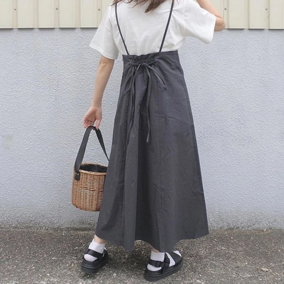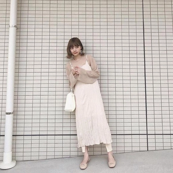 くしゅっとした素材感が優しいキャミワンピース。こちらもDHOLICのアイテムです。モデルの方はライトブラウンのブラウスと白ワンピースをトレンドのスリットレギンスにオン。アースカラーのワントーンコーデも今年らしく、トレンド感があります。韓国ブランドながら日本の最新トレンドがバッチリ抑えられるのも,DHOLICだからこそですね!