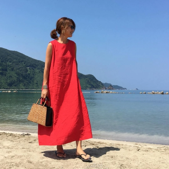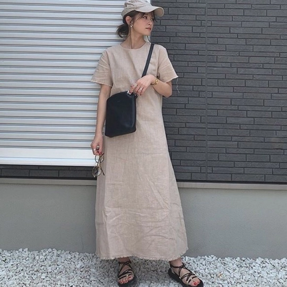 リネン素材で着心地のよいワンピースです。スッキリとしたシルエットでカジュアルに着こなせる1枚。細いストラップのサンダルやアクセサリーと合わせてレディなコーデにしてもきれいですし、厚底のスポサンとキャップでスポーティーコーデにしてもよさそうですね☆