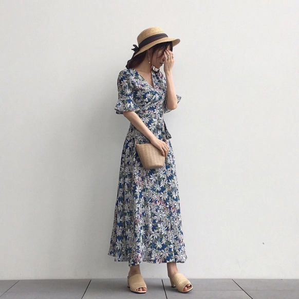 おとなっぽい大柄のワンピース。青や水色はシーズンの定番色ですね。夏らしいカラーが涼しげで小物の素材感ともマッチしています♡二の腕をしっかり隠してくれる袖の長さがちょうどいいですね。ラップデザインのVネックは季節感があります☆