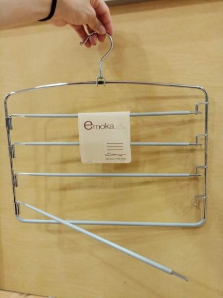 こちらは、「スカートズボンハンガー」195円(税込)。1本で4枚分掛けられ、収納スペースを節約できるスカートハンガーです。限られたスペースに収納するのにとても便利なアイテム。クリップ部分は丈夫なバネで衣類をしっかりと挟みます!